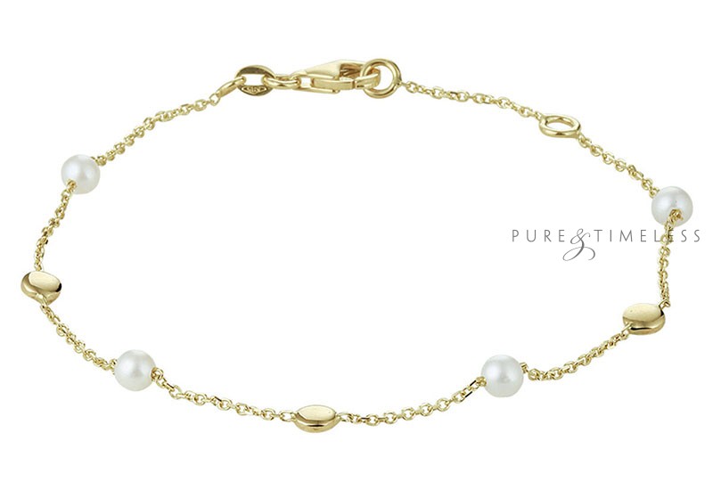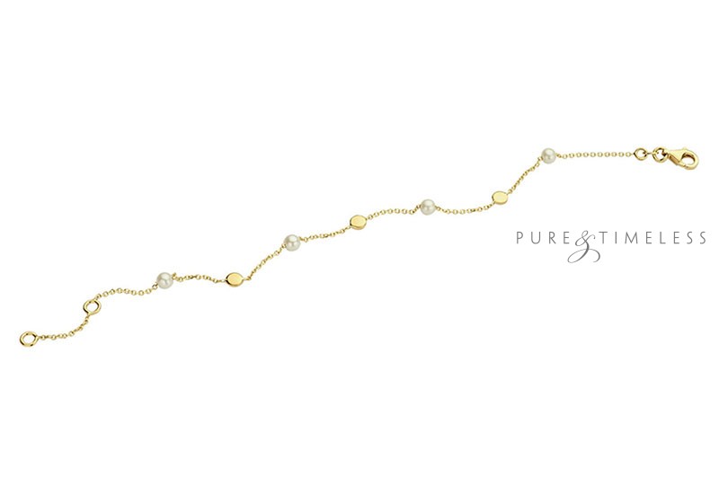 Gouden armband met zoetwaterparels en gouden bolletjes. Deze armband is subtiel en elegant en past in elke garderobe. Daardoor zeer geschikt om cadeau te doen. De ivoorwitte parels zijn rond van vorm en van de hoge AA+ kwaliteit. De parels hebben een mooi luster, dat is de mate van glans.