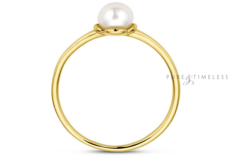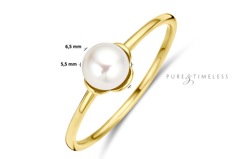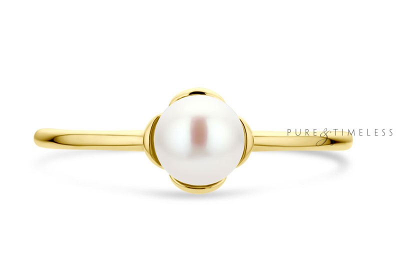 Gouden parel ring met een zoetwaterparel. De parel aan deze ring is een 5,5 mm grote zoetwaterparel met een mooi luster, dat is de mate van glans. De parel is ivoorwit van kleur. Het pareltje ligt in een bloem vorm. De ring is gemaakt van stevig 14 karaat goud. Een eenvoudige ring die daarom juist zeer geschikt is om elke dag te dragen. Een bijzonder cadeau voor een bijzonder moment.