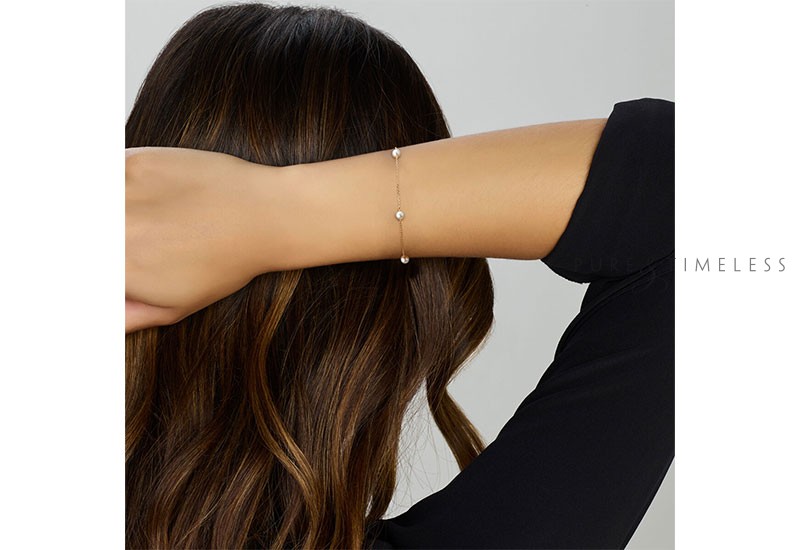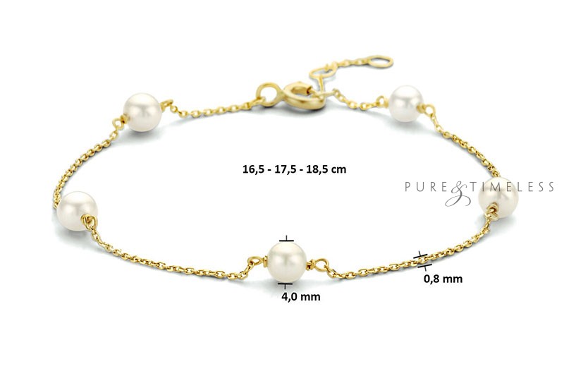 14k Geelgouden armband uitgevoerd met schitterende parels. De armband heeft een breedte van 4mm en draaglengtes van 16.5, 17.5 en 18.5mm. Deze armband past dus altijd en is daardoor zeer geschikt als geschenk. De schakelbreedte is 0.8mm. Deze armband is subtiel en elegant en past in elke garderobe. De ivoorwitte parels zijn rond van vorm en van de hoge AA+ kwaliteit. De parels hebben een mooi luster, dat is de mate van glans.